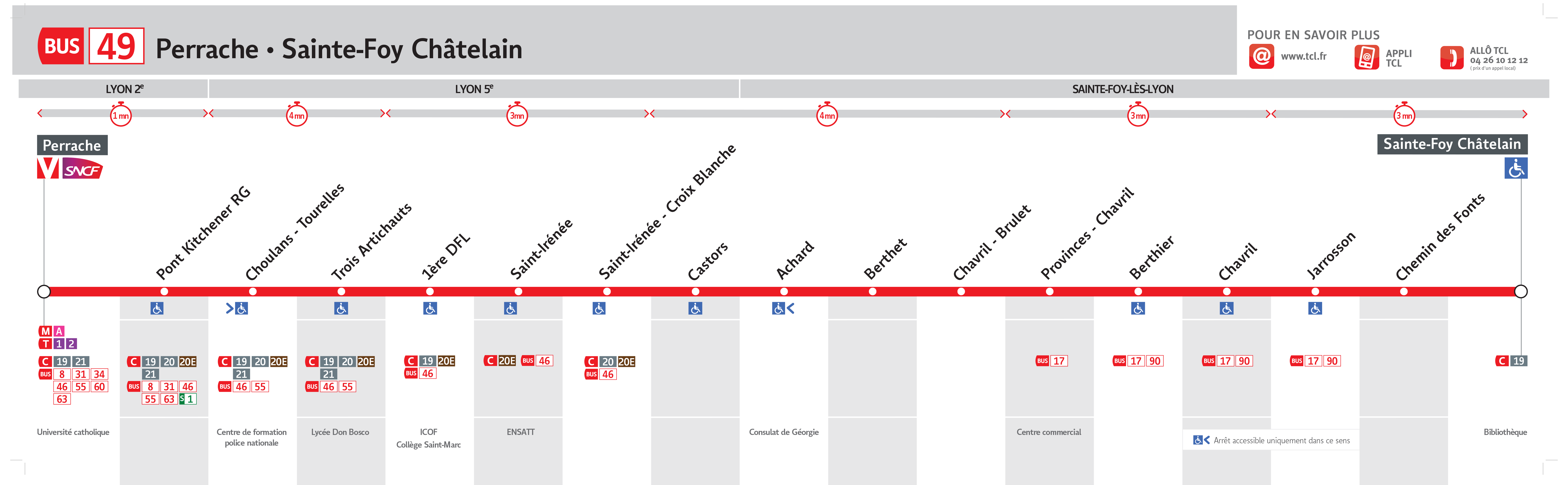 Le Bus 49 est une des lignes du réseau Transports en Commun Lyonnais (TCL) reliant les 2 communes Sainte-Foy-lès-Lyon et Lyon 2e Arrondissement. La station de départ Ste Foy Châtelain se situe à l'adresse 30 AVENUE DU 11 NOVEMBRE Sainte-Foy-lès-Lyon et la station d'arrivée Perrache est localisée à l'adresse PLACE CARNOT Lyon 2e Arrondissement. Les arrêts desservis par le Bus 49 sont au nombre de 17 situés dans les 3 communes : Lyon 5e Arrondissement, Sainte-Foy-lès-Lyon, et Lyon 2e Arrondissement.