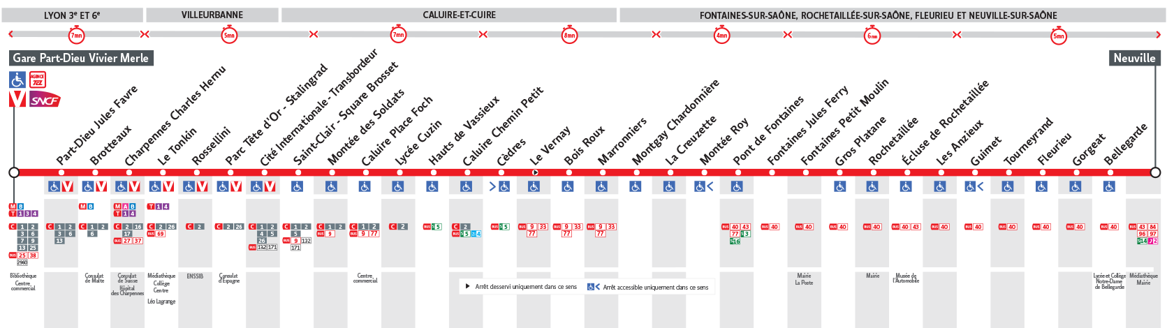 Le Bus 70 est une des lignes du réseau Transports en Commun Lyonnais (TCL) reliant les 2 communes Neuville-sur-Saône et Lyon 3e Arrondissement. La station de départ Neuville se situe à l'adresse 7 QUAI PASTEUR Neuville-sur-Saône et la station d'arrivée Gare Part-Dieu V.Merle est localisée à l'adresse 9 BOULEVARD MARIUS VIVIER MERLE Lyon 3e Arrondissement. Les arrêts desservis par le Bus 70 sont au nombre de 34 situés dans les 8 communes : Caluire-et-Cuire, Neuville-sur-Saône, Fontaines-sur-Saône, Rochetaillée-sur-Saône, Lyon 6e Arrondissement, Lyon 3e Arrondissement, Fleurieu-sur-Saône, et Villeurbanne.