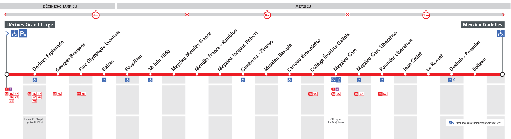 Le Bus 85 est une des lignes du réseau Transports en Commun Lyonnais (TCL) reliant les 2 communes Meyzieu et Décines-Charpieu. La station de départ Meyzieu Centre Aquatique se situe à l'adresse 10D RUE JEAN JAURES Meyzieu et la station d'arrivée Décines Grand Large est localisée à l'adresse 24 RUE FRANCISCO FERRER Décines-Charpieu. Les arrêts desservis par le Bus 85 sont au nombre de 27 situés dans les 2 communes : Meyzieu et Décines-Charpieu.