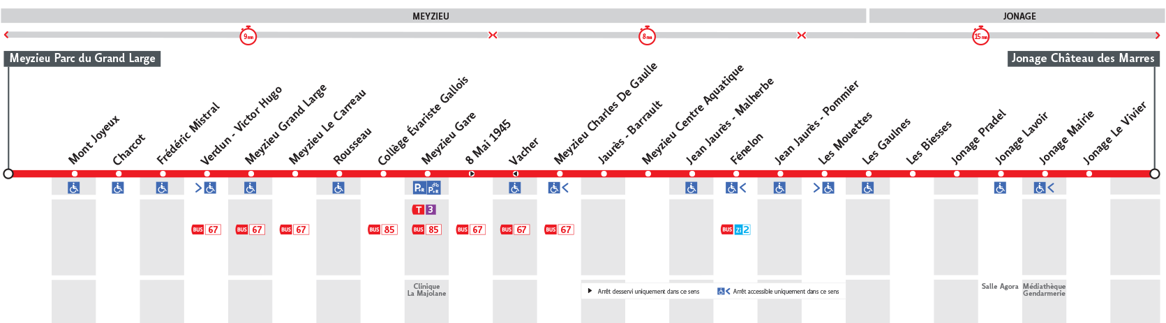 Le Bus 95 est une des lignes du réseau Transports en Commun Lyonnais (TCL) reliant les 2 communes Jonage et Meyzieu. La station de départ Jonage Chât. des Marres se situe à l'adresse 121 RUE NATIONALE Jonage et la station d'arrivée Meyzieu Parc Grand Large est localisée à l'adresse RUE VICTOR HUGO Meyzieu. Les arrêts desservis par le Bus 95 sont au nombre de 25 situés dans les 2 communes : Meyzieu et Jonage.