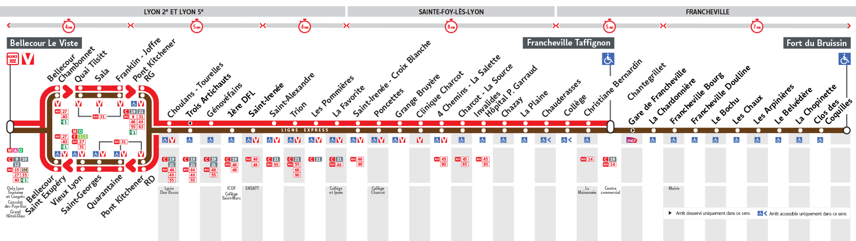 Le Bus C20 est une des lignes du réseau Transports en Commun Lyonnais (TCL) reliant les 2 communes Francheville et Lyon 2e Arrondissement. La station de départ Fort du Bruissin se situe à l'adresse 26 CHEMIN DU FORT Francheville et la station d'arrivée Bellecour Le Viste est localisée à l'adresse 16 PLACE BELLECOUR Lyon 2e Arrondissement. Les arrêts desservis par le Bus C20 sont au nombre de 36 situés dans les 4 communes : Francheville, Lyon 5e Arrondissement, Lyon 2e Arrondissement, et Sainte-Foy-lès-Lyon.
