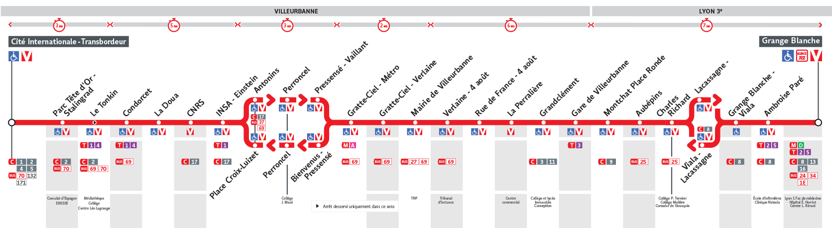 Le Bus C26 est une des lignes du réseau Transports en Commun Lyonnais (TCL) reliant les 2 communes Lyon 3e Arrondissement et Villeurbanne. La station de départ Grange Blanche se situe à l'adresse 1 PLACE D ARSONVAL Lyon 3e Arrondissement et la station d'arrivée Cité Inter Transbordeur est localisée à l'adresse 2 BOULEVARD DE LA BATAILLE DE STALINGRAD Villeurbanne. Les arrêts desservis par le Bus C26 sont au nombre de 25 situés dans les 2 communes : Villeurbanne et Lyon 3e Arrondissement.