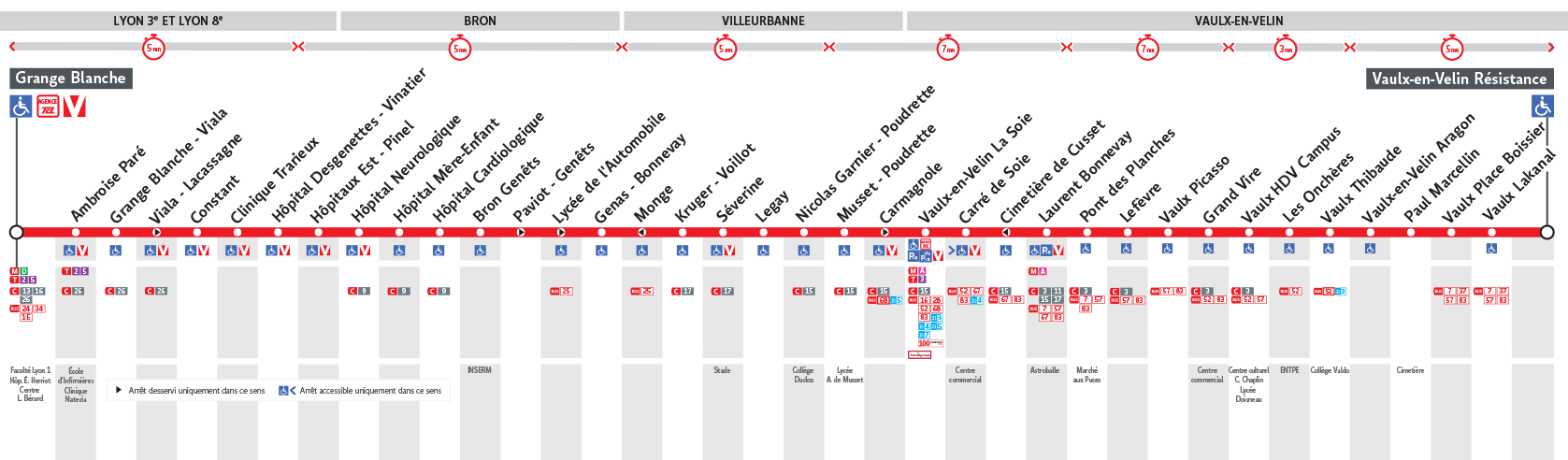 Le Bus C8 est une des lignes du réseau Transports en Commun Lyonnais (TCL) reliant les 2 communes Vaulx-en-Velin et Lyon 3e Arrondissement. La station de départ Vaulx - Résistance se situe à l'adresse 12 RUE DE LA RESISTANCE Vaulx-en-Velin et la station d'arrivée Grange Blanche est localisée à l'adresse 6 AVENUE ROCKEFELLER Lyon 3e Arrondissement. Les arrêts desservis par le Bus C8 sont au nombre de 37 situés dans les 4 communes : Villeurbanne, Vaulx-en-Velin, Lyon 3e Arrondissement, et Bron.