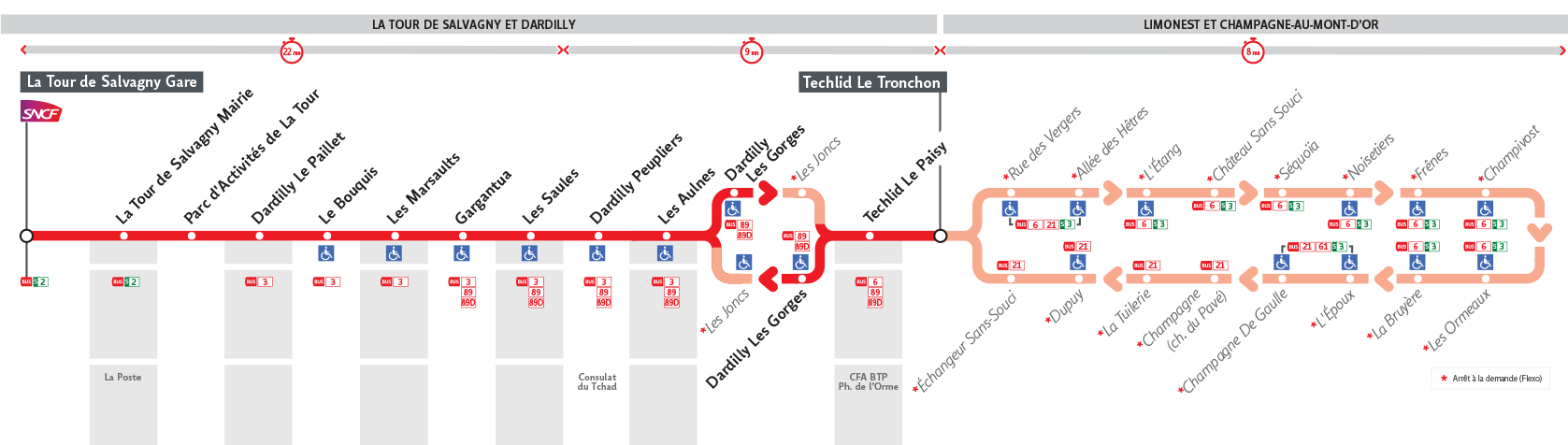Le Bus GE4 est une des lignes du réseau Transports en Commun Lyonnais (TCL) reliant les 2 communes Limonest et La Tour-de-Salvagny. La station de départ Techlid Le Tronchon se situe à l'adresse RUE SANS SOUCI Limonest et la station d'arrivée La Tour de Salvagny Gare est localisée à l'adresse 81 RUE DE LA GARE La Tour-de-Salvagny. Les arrêts desservis par le Bus GE4 sont au nombre de 36 situés dans les 4 communes : Dardilly, Champagne-au-Mont-d'Or, Limonest, et La Tour-de-Salvagny.