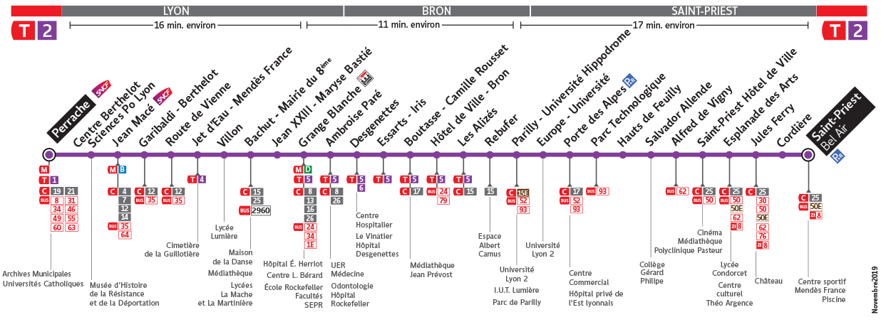 Le Tram T2 est une des lignes du réseau Transports en Commun Lyonnais (TCL) reliant les 2 communes Saint-Priest et Lyon 2e Arrondissement. La station de départ Saint-Priest Bel Air se situe à l'adresse 33 RUE DE LA CORDIERE Saint-Priest et la station d'arrivée Hôtel Région Montrochet est localisée à l'adresse 101 COURS CHARLEMAGNE Lyon 2e Arrondissement. Les arrêts desservis par le Tram T2 sont au nombre de 33 situés dans les 5 communes : Lyon 2e Arrondissement, Lyon 7e Arrondissement, Lyon 8e Arrondissement, Bron, et Saint-Priest.