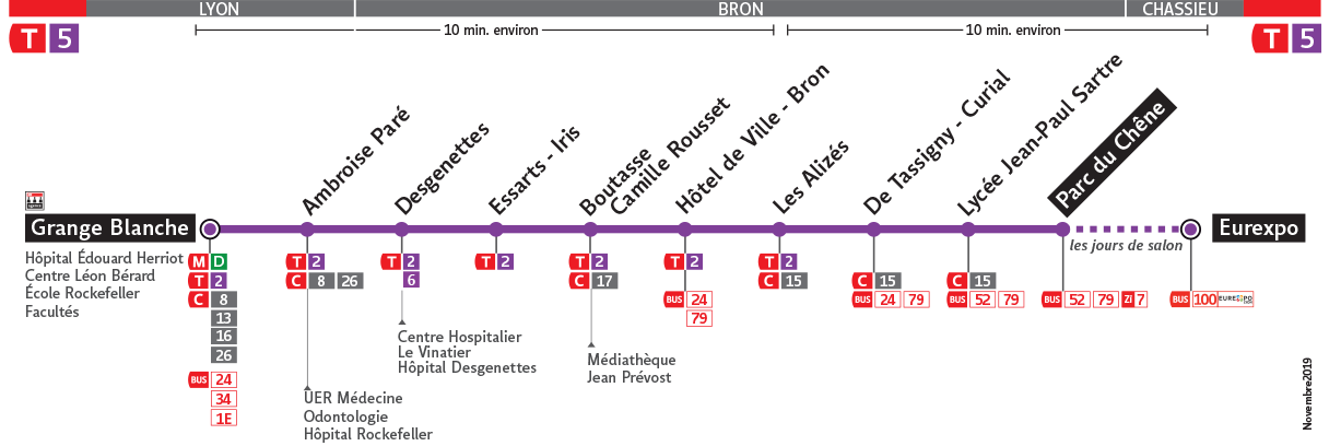 Le Tram T5 est une des lignes du réseau Transports en Commun Lyonnais (TCL) reliant les 2 communes Chassieu et Lyon 8e Arrondissement. La station de départ Eurexpo Entrée Princ. se situe à l'adresse BOULEVARD DE L EUROPE Chassieu et la station d'arrivée Grange Blanche est localisée à l'adresse 4 AVENUE ROCKEFELLER Lyon 8e Arrondissement. Les arrêts desservis par le Tram T5 sont au nombre de 11 situés dans les 3 communes : Lyon 8e Arrondissement, Bron, et Chassieu.