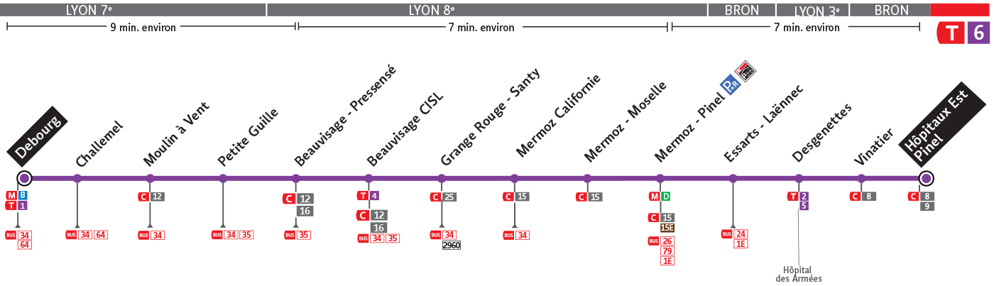Le Tram T6 est une des lignes du réseau Transports en Commun Lyonnais (TCL) reliant les 2 communes Bron et Lyon 7e Arrondissement. La station de départ Hôpitaux Est - Pinel se situe à l'adresse 59 BOULEVARD PINEL Bron et la station d'arrivée Debourg est localisée à l'adresse 94 AVENUE DEBOURG Lyon 7e Arrondissement. Les arrêts desservis par le Tram T6 sont au nombre de 16 situés dans les 4 communes : Lyon 7e Arrondissement, Lyon 8e Arrondissement, Bron, et Lyon 3e Arrondissement.